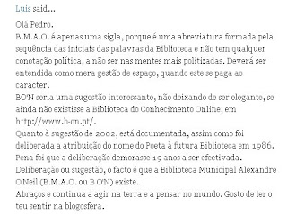Não me custa reconhecer que um blog (este blog) pretende fomentar o diálogo, o debate de ideias e que não pretendo que os leitores passem por aqui para me dar beijinhos e desejar bom fds (fim-de-semana), daí que quando recebo comentários como este as coisas fazem sentido [obviamente sem menosprezo para os comentadores habituais que colocam comentários divertidos, irónicos, poéticos e tal]